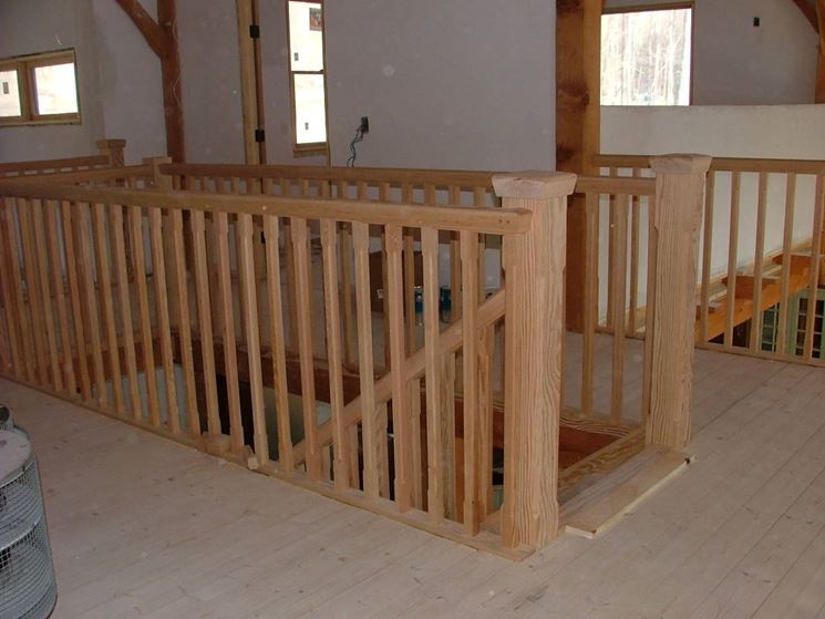 Uno dei materiali maggiormente utilizzati per le ringhiere per interni per scale è il legno, molto elegante per sua propria natura, infatti riesce a trasmettere bellezza e armonia a tutti gli ambienti della casa; il legno è un materiale che riesce a sopportare bene gli sbalzi di temperatura e l'umidità, oltre ad essere anche molto duttile, al punto che possono essere decorati e intarsiati con motivi di vario genere, per diventare sempre più elegante. Si possono trovare diversi tipi di legno a seconda delle caratteristiche intrinseche: in base alla durezza, esistono legni duri, semi-duri e morbidi, mentre in base alla colorazione è possibile trovare legni bruni, chiari o rossi. Un'ulteriore caratteristica del legno risiede nella sua naturalezza che lo rende biodegradabile e non nocivo per l'ambiente esterno.