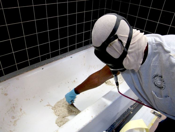 Se vogliamo imparare come risistemare lo smalto della vasca da bagno il primo passo da fare è pretrattare le superfici. E' la parte del lavoro che precede il recupero vero e proprio dello smalto. Si procede con la pulizia completa della vasca, facendo molta attenzione al tipo di prodotto che si utilizza: deve essere adatto alle ceramiche per sanitari. Solitamente si tratta di sostanze a base di acido cloridrico, dunque potenzialmente pericolose per chi le maneggia. E' quindi indispensabile indossare guanti da lavoro e una mascherina protettiva per il viso, onde evitare di inalare i fumi tossici. La stesura di queste soluzioni consente di rimuovere tracce e residui di calcare e di sapone preparando al meglio le superfici per la pittura con smalto, aumentandone la capacità di adesione. Tuttavia in alcuni casi potrebbero presentarsi problemi un po' più complessi, come nel caso di profonde lesioni allo smalto.